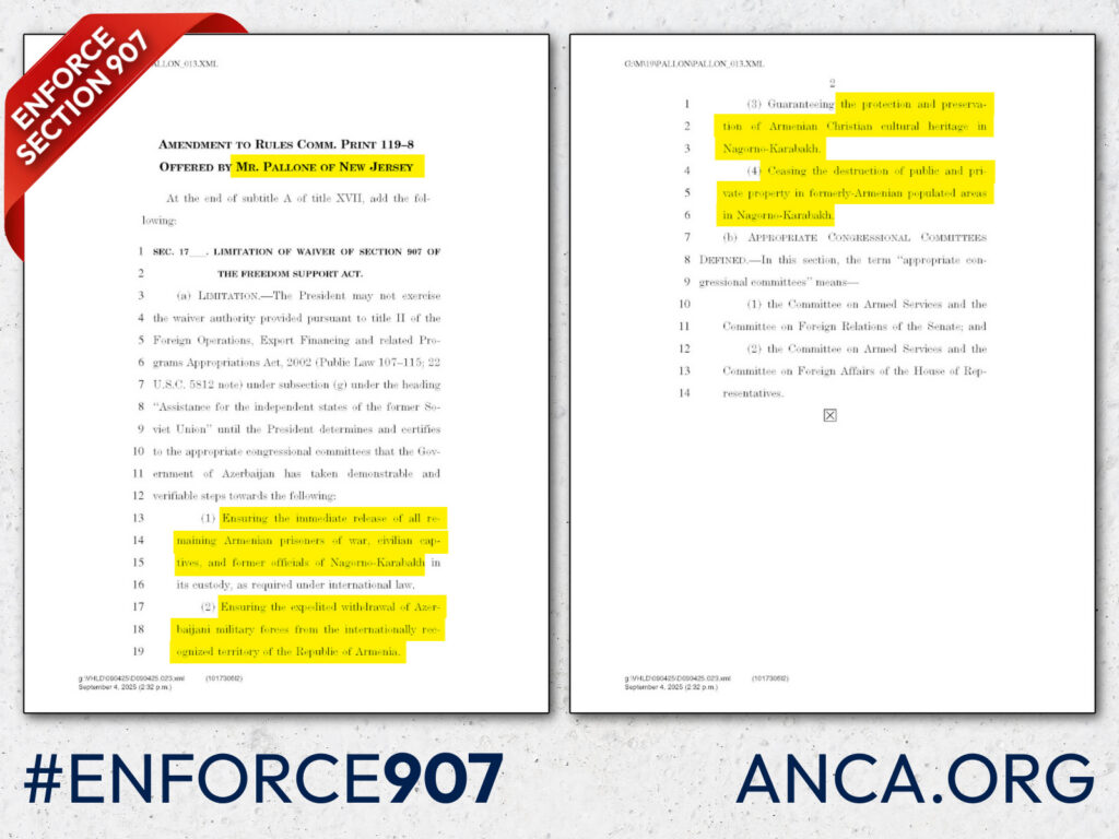 Amendment 1097, authored by Congressman Frank Pallone (D-NJ), places strict limits on the President’s authority to waive Section 907 of the FREEDOM Support Act, which restricts U.S. aid to Azerbaijan. Under the proposed language, any future waiver would require concrete Azerbaijani action – including the release of Armenian prisoners, a full military withdrawal from Armenian territory, and guarantees for the protection of Armenian religious and cultural heritage sites. This amendment responds directly to Azerbaijan’s role in the genocidal ethnic cleansing of Artsakh and its continued attacks on Armenia’s sovereignty.