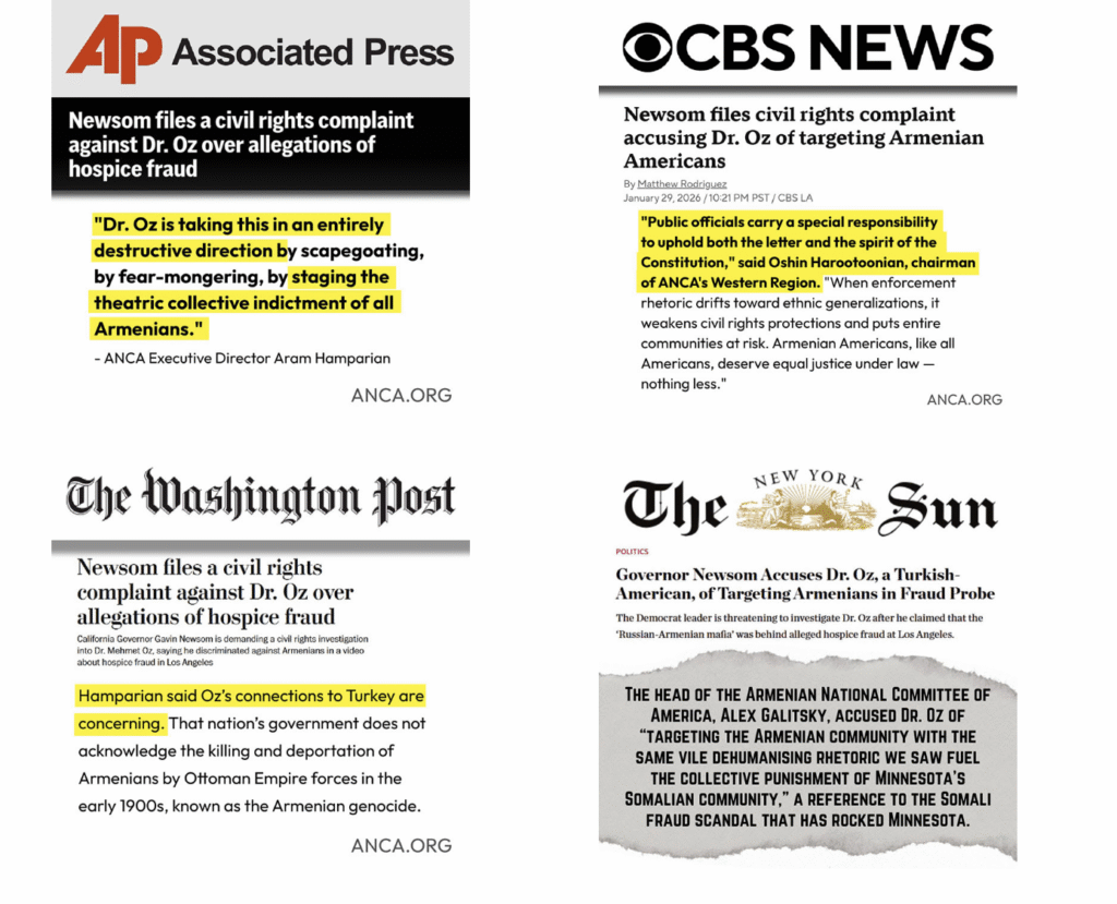 The ANCA Western Region swiftly condemned Dr. Oz’s actions in an official statement. “Public officials carry a special responsibility to uphold both the letter and the spirit of the Constitution,” stated Oshin Harootoonian, Chairman of ANCA’s Western Region, in remarks covered by CBS News. “When enforcement rhetoric drifts toward ethnic generalizations, it weakens civil rights protections and puts entire communities at risk. Armenian Americans, like all Americans, deserve equal justice under law – nothing less.”