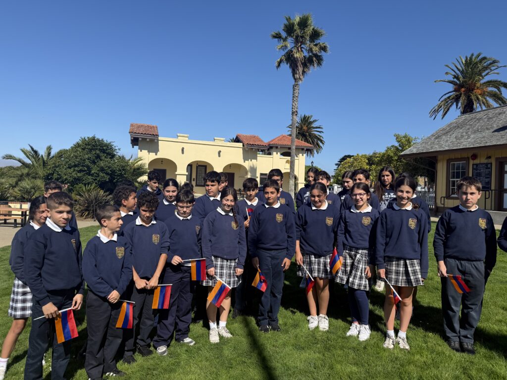 Middle school students from Krouzian Zekarian Vasbouragan (KZV) Armenian School performed the national anthems of the United States, Armenia, and Artsakh, creating a powerful moment of solidarity as the Colma Police Department raised the Armenian flag.