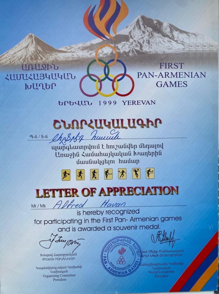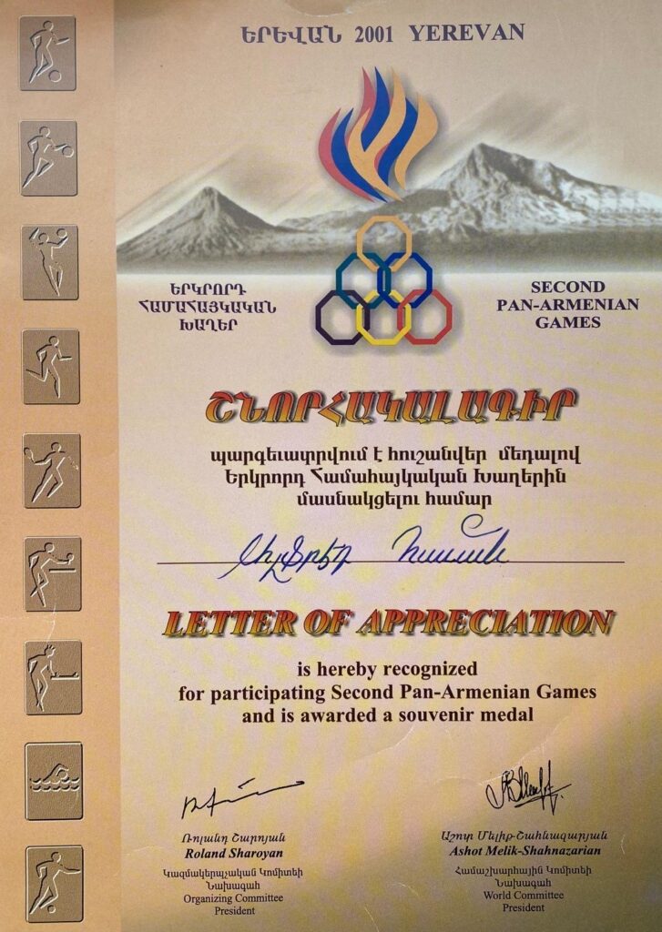 Նա մաս է կազմել և ներկայացրել է իրանահութիւնն ու Արարատ կազմակերպութիւնը ՀՀ Օլիմպիական կոմիտէում և Հայաստանում կայացող Համահայկական խաղերի կազմակերպիչ Կոմիտէի գործօն անդամ է եղել և մինչև օրս նոյն կոմիտէի պատւոյ անդամ է: Նա նաև Հայաստանի Թեթևատլետի Ֆրդէրացիայի պատւոյ անդամ է: Անգամներ գնահատուել է Հայաստանումշ իսկ Համահայկական խաղերում իր ներդրումների համար ՀՀ Նախագահ՝ Սերժ Սարգսեանի կողմից արժանացել է «Երախտագիտութեան Մեդալ»ին: