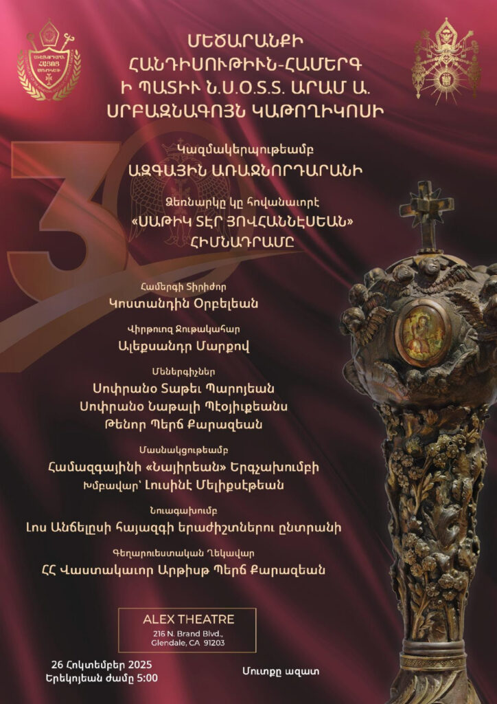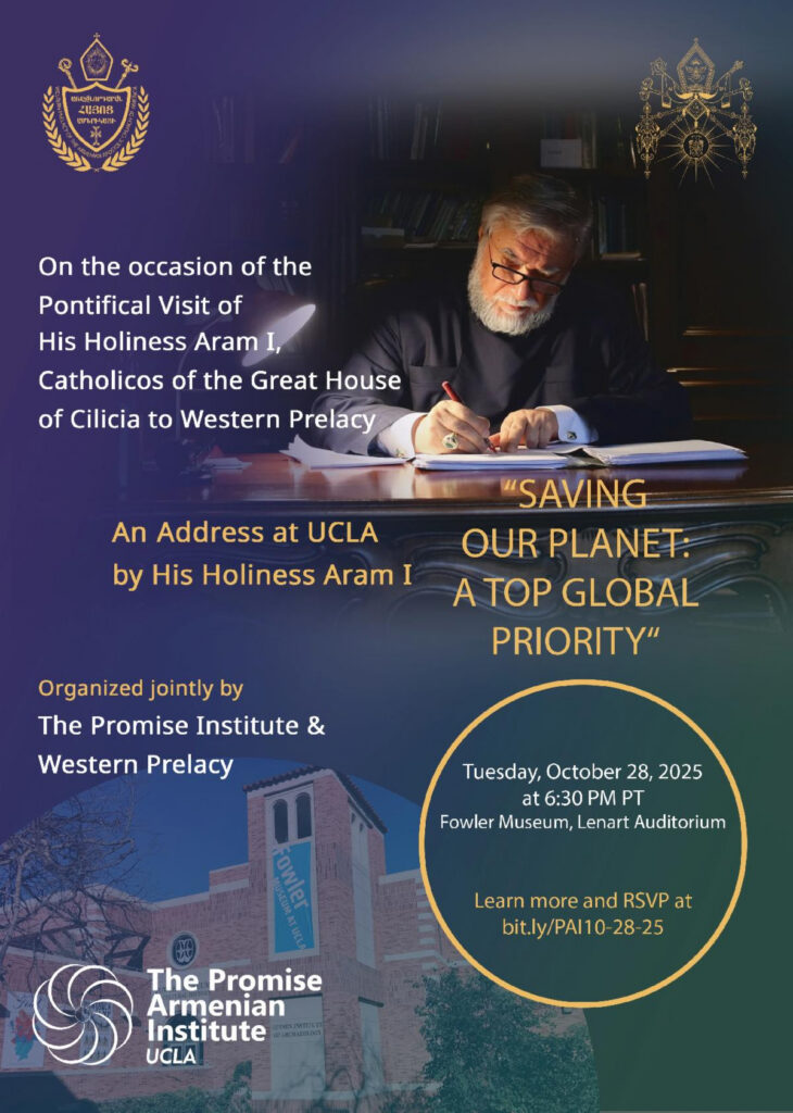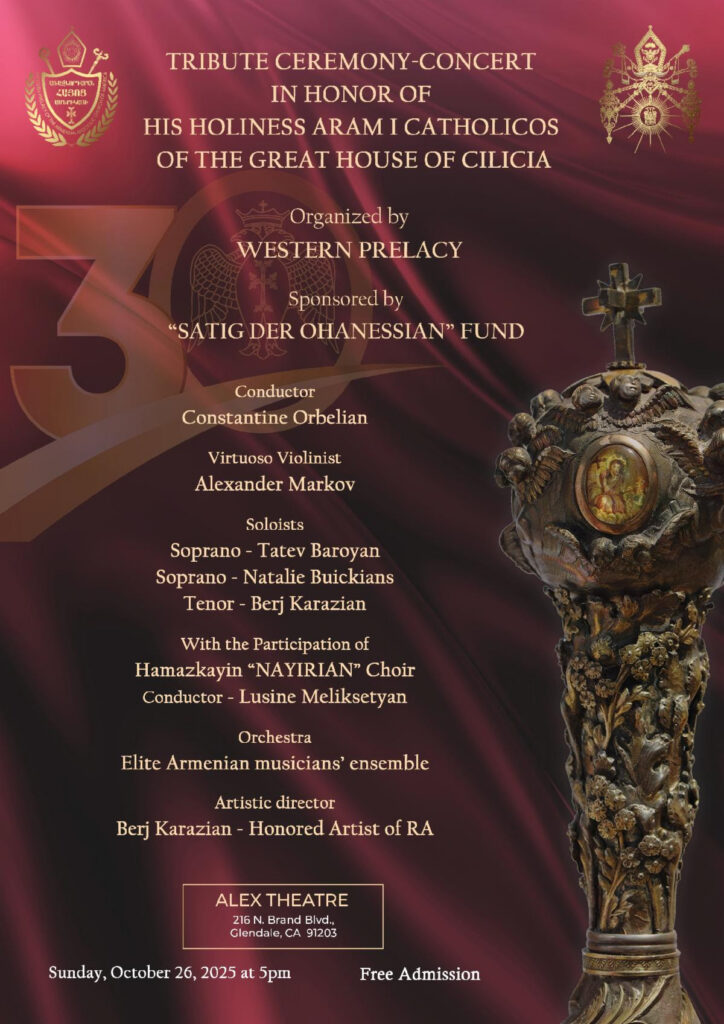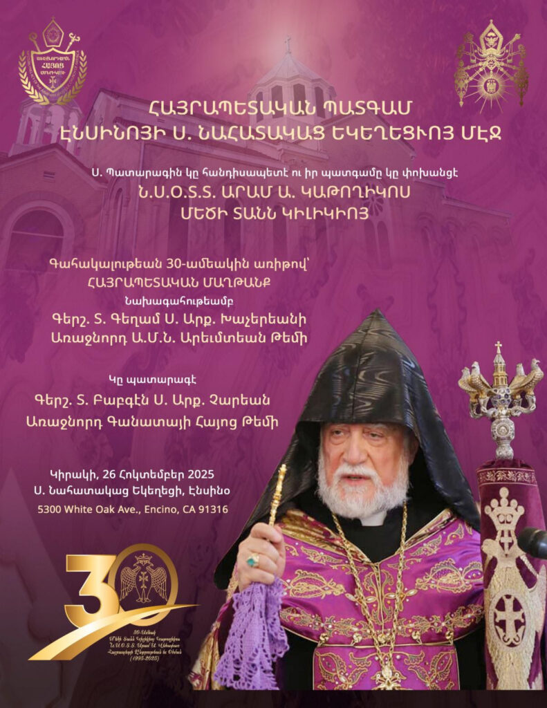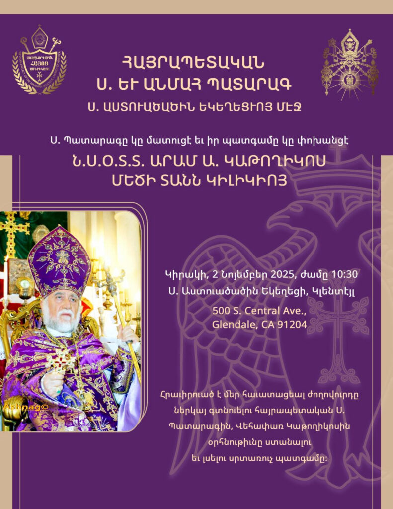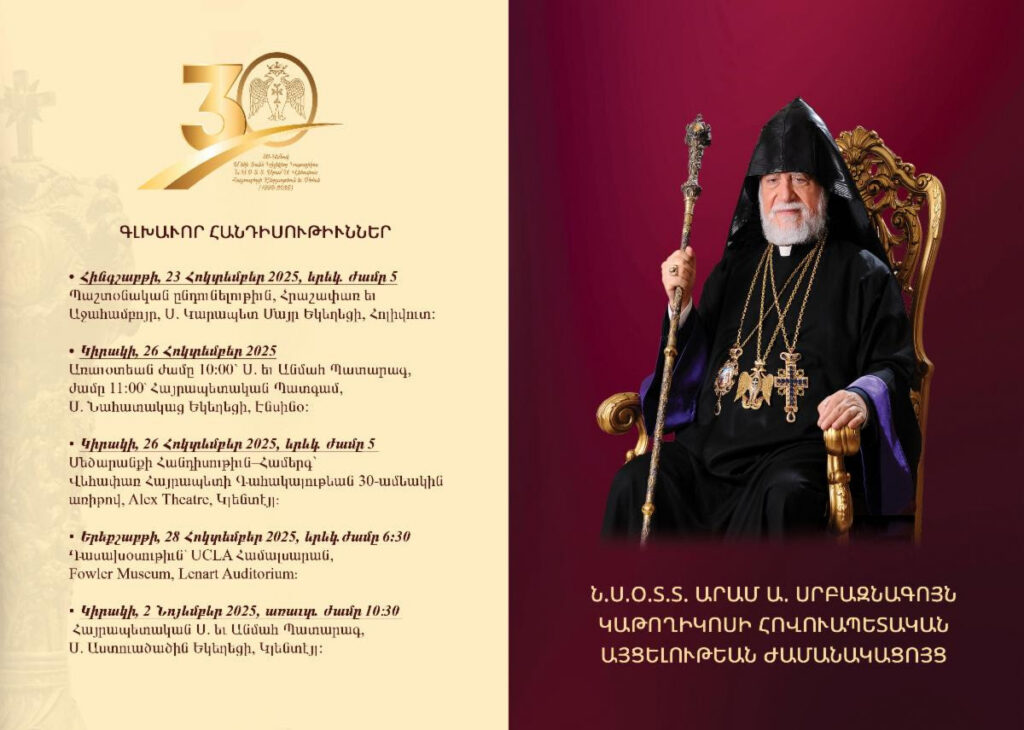 Հիւսիսային Ամերիկայի Արեւմտեան Հայոց Թեմին շնորհելիք հովուապետական այցելութեան առաջին հանգրուանը Լոս Անճելըսը ըլլալով, Ն.Ս.Օ.Տ.Տ. Արամ Ա. Վեհափառ Հայրապետը Թորոնթոյէն (Գանատա) ժամանեց Լոս Անճելըս, Չորեքշաբթի, 22 Հոկտեմբեր 2025-ին, ընկերակցութեամբ պատուիրակութեան անդամ Գանատայի Հայոց Թեմի առաջնորդ Գերաշնորհ Տ. Բաբգէն Արք. Չարեանի։