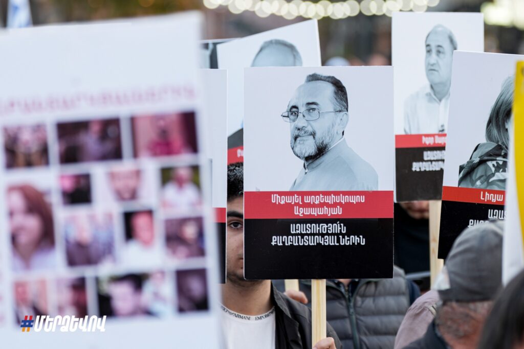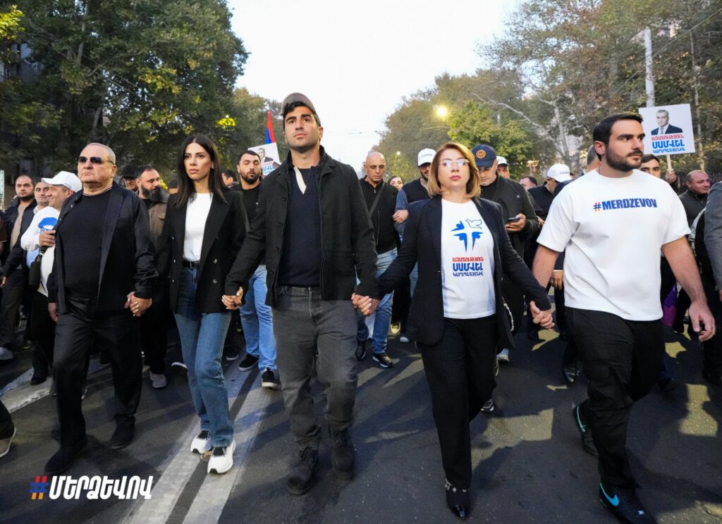Հանրահաւաքէն ետք Սամուէլ Կարապետեանի աջակիցները քայլերթով հասան Ազգային անվտանգութեան ծառայութեան շէնքին առջեւ` պահանջելով ազատ արձակել կալանաւորուած Սամուէլ Կարապետեանը: