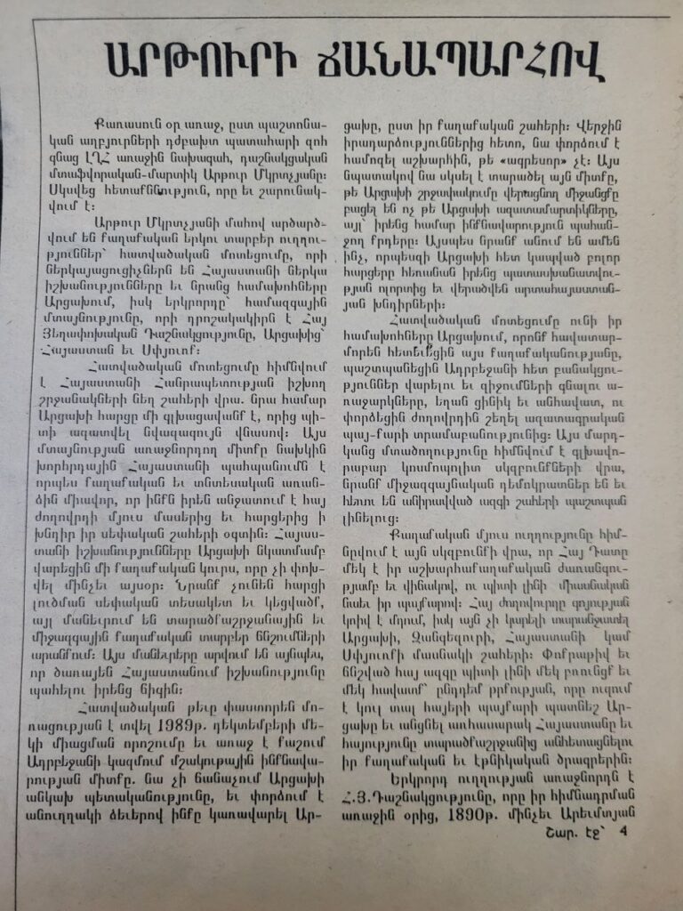 ԼՂՀ ԳԽ առաջին նախագահ (Արցախի 1-ին ղեկավար), դաշնակցական Արթուր Մկրտչեանի եղերական մահուան քառասունքի օրը ՀՅԴ Արցախի կազմակերպութեան հրատարակած «Պայքար» թերթը մի հետաքրքիր ու չափազանց արդիական յօդուած է հրապարակել Արցախի հարցի վերաբերեալ։ Առանձնացուած են երկու մօտեցումներ՝ ՀԱՏՎԱԾԱԿԱՆԸ, որի ներկայացուցիչն է հանդիսացել Լեւոն Տեր-Պետրոսեանի իշխանութիւնը, 2-դը՝ ՀԱՄԱԶԳԱՅԻՆ ՄՏԱՅՆՈՒԹՅՈՒՆԸ, որի դրօշակակաիրն է եղել ՀՅԴ-ն։